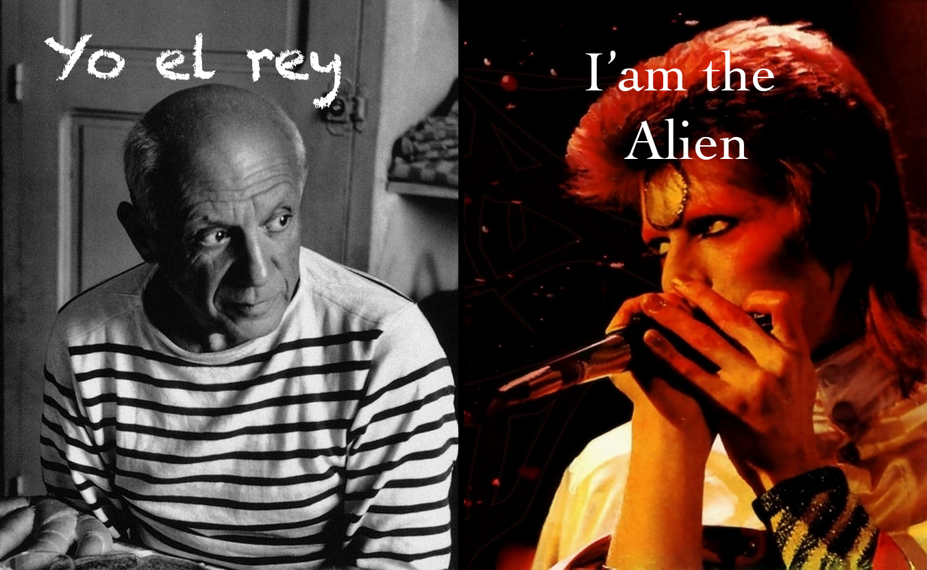 Contraponer estos dos monstruos del arte del siglo XX no es tarea fácil, ya que a primera vista lo que resalta es su repercusión en diferentes generaciones, lograr la consagración en vida, el haber cambiado constantemente de estilo o incluso el simple hecho de utilizar seudónimos, Picasso se llamaba en realidad Pablo Diego José Ruiz Picasso (tiene varios nombres más en su acta de nacimiento) y Bowie se llama David Robert Jones.