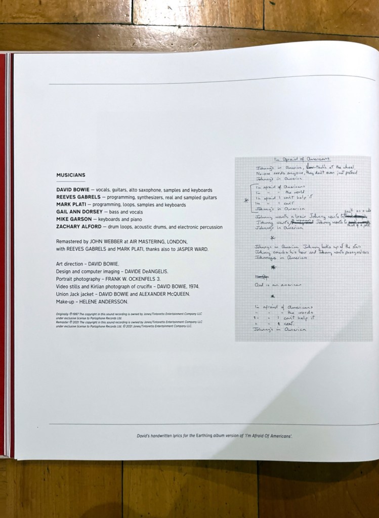 Muchos lo consideran como el mejor disco de Bowie de la década de los 90, esto se destaca en el libro que salió hace pocos meses dentro de la Box Brilliant Adventure 1992 – 2001, donde se compilan todos los discos de estudio de Bowie en ese periodo y que incluye el recién lanzado album Toy (en la caja se lanzó dos meses antes a modo de regalo a los coleccionistas). En el libro vienen los relatos canción por canción de Gabrels y Mark Plati, quien fue uno de los ingenieros del disco y que conoció a los músicos en Looking Glass Studios de Nueva York, de propiedad del compositor Philip Glass. En esos relatos los colaboradores muestran a un energético Bowie a quien le fluían las ideas como en un estado de efervescencia juvenil, logrando armar un disco híbrido que confluía estilos de música electrónica diversa, tanto de la época como de tiempos pasados como el krautrock alemán. Se destaca además que los samples en aquel tiempo los músicos los tomaban de otras bandas para alterarlos, en el caso de Earthlig eran producciones generados por los mismos músicos, por el ejemplo en la batería Alford grababa sonidos y luego estos eran llevados al computador, lo mismo con las guitarras, creando una música mucho más sintética y “artificial”, alejándolo del rock o del mismo 1.Outside, donde Eno se había negado al uso de estas técnicas.